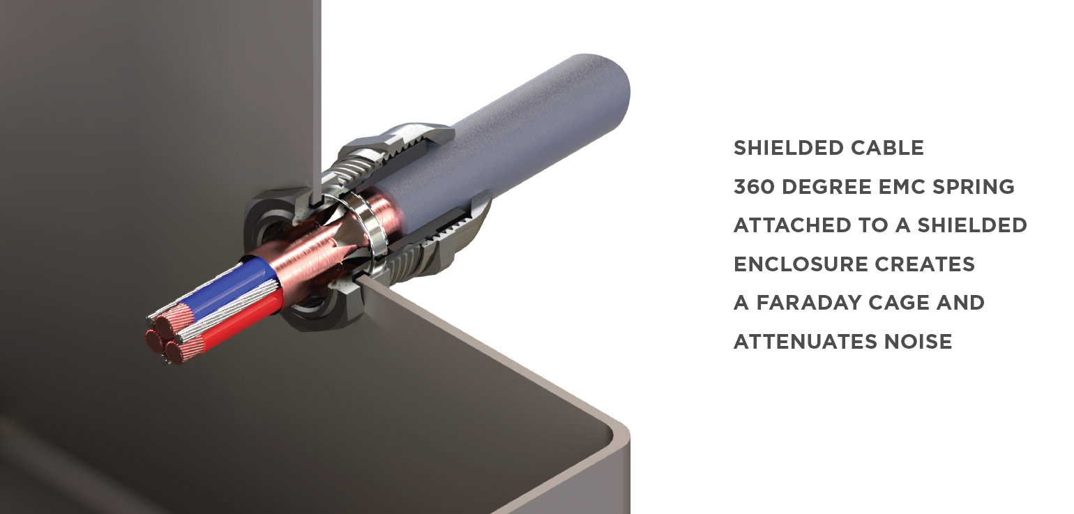 Cable and enclosure manufacturers offer various shielded solutions, designed to attenuate or provide a barrier to electrical noise. However, without effective grounding of the cable shield at the cable entry point, the effects of these solutions may be negated!