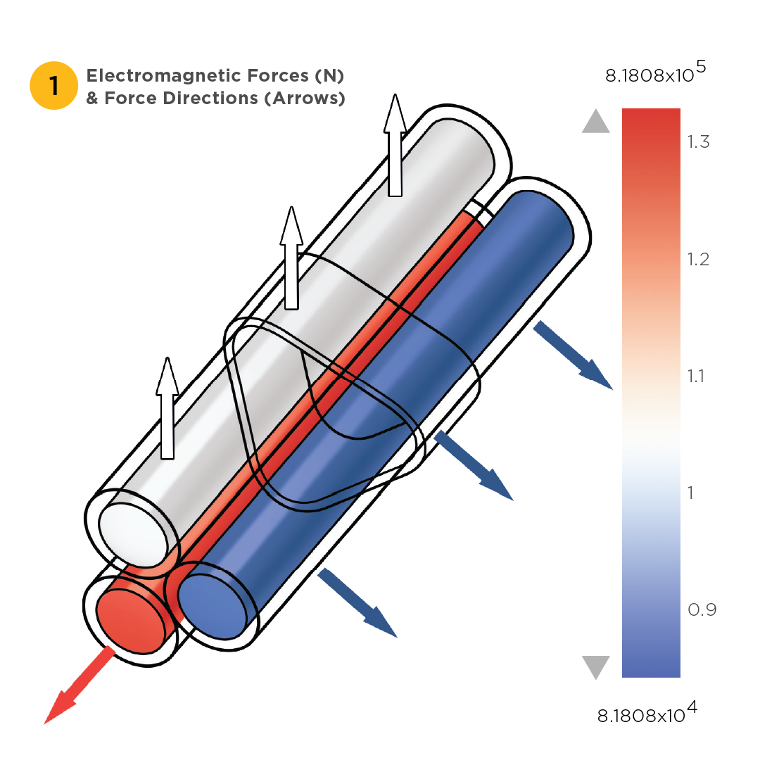 To avoid the inevitable delays in testing all of the possible permutations that may arise, a time-dependent multiphysics model including currents, induced electromagnetic forces, material plasticity and contact analysis has been set up. This can fully describe and simulate the dynamic load conditions on the cables and cable cleats during a short circuit fault condition.